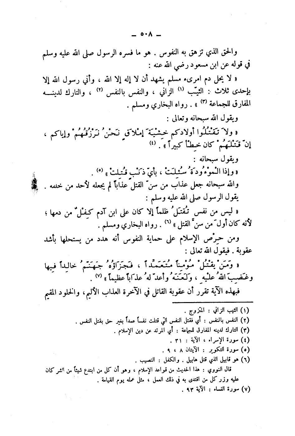 هو ما فسره الرسول صلى الله عليه وسلم في قوله عن ابن مسعود رضي الله عنه: " لا يحل دم امرئ مسلم يشهد أن لاإله إلا الله، وأني رسول الله إلا بإحدى ثلاث، الثيب (1) الزاني، والنفس بالنفس (2) ، والتارك لدينه المفارق للجماعة (3) ".