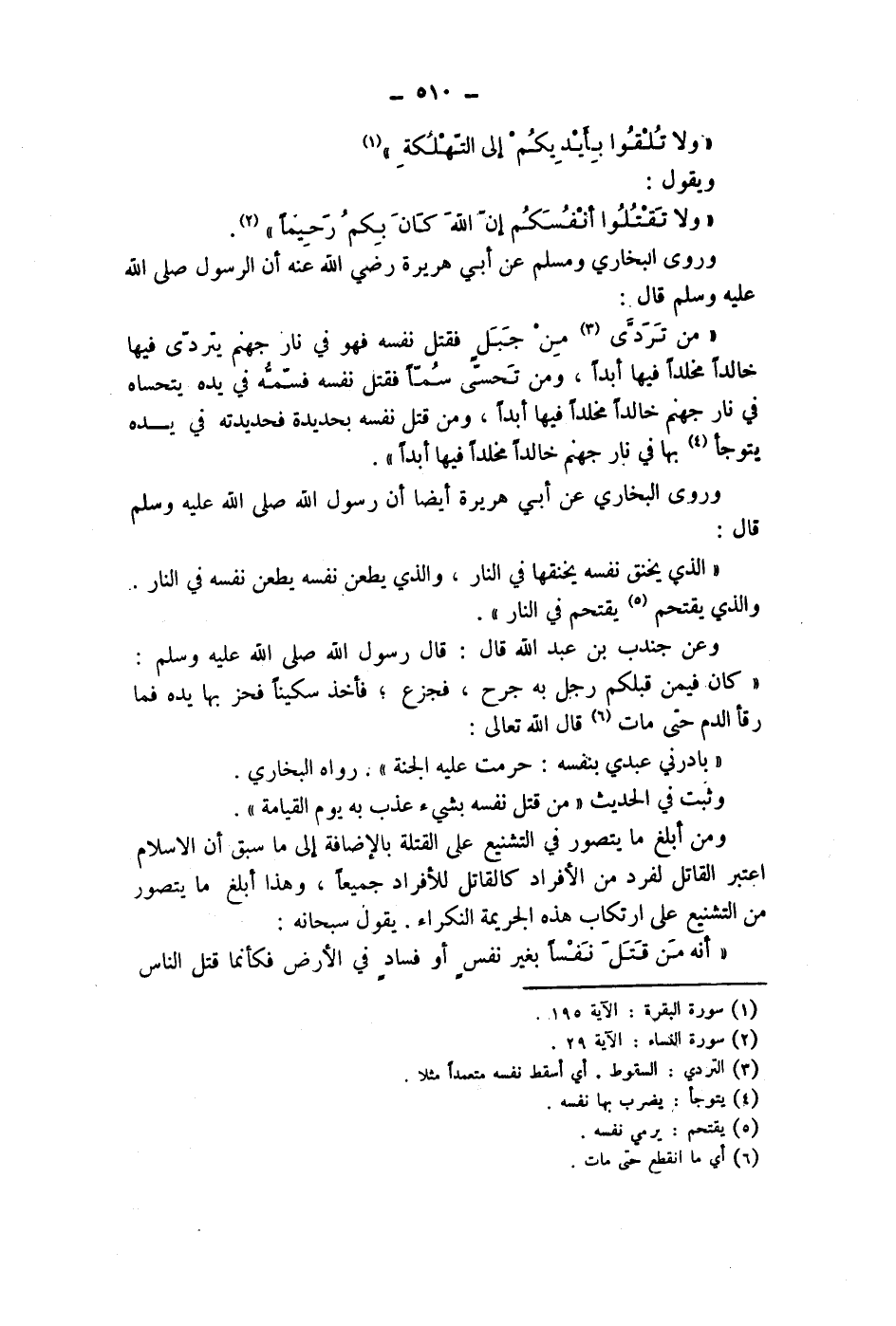 وروى البخاري ومسلم عن أبي هريرة رضي الله عنه أن الرسول صلى الله عليه وسلم قال: " من تردى (3) من جبل فقتل نفسه فهو في نار جهنم يتردى فيها خالدا مخلدا فيها أبدا، ومن تحسى سما فقتل نفسه فسمه في يده يتحساه في نار جهنم خالدا مخلدا فيها أبدا، ومن قتل نفسه بحديدة فحديدته في يده يتوجأ (4) بها في نار جهنم خالدا مخلدا فيها أبدا ".