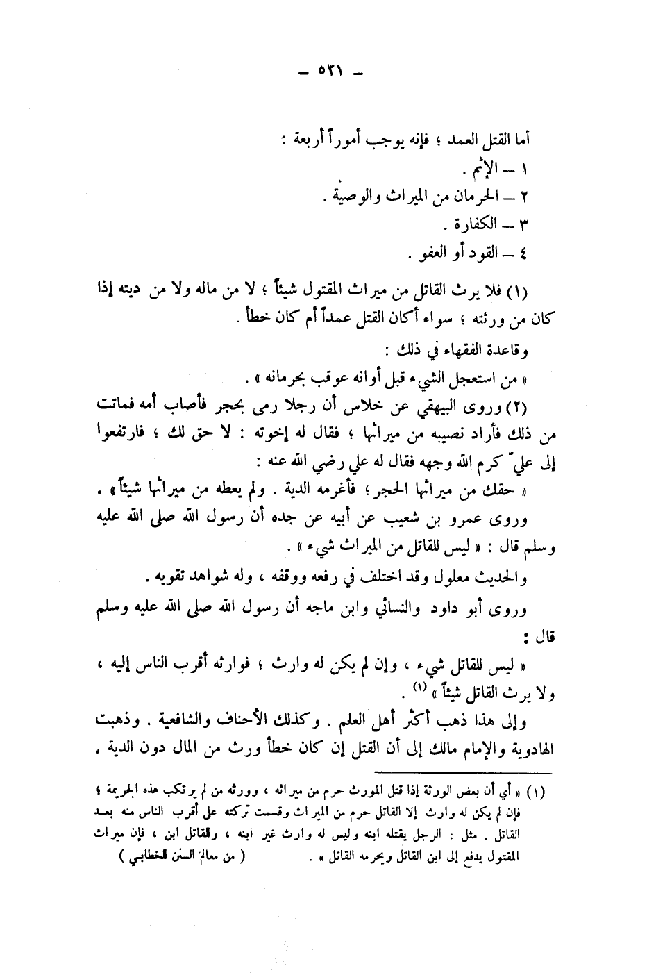 (1) " أي أن بعض الورثة إذا قتل المورث حرم من ميراثه، وورثه من لم يرتكب هذه الجريمة، فإن لم يكن له وارث إلا القاتل حرم من الميراث وقسمت تركته على أقرب الناس منه بعد القاتل.