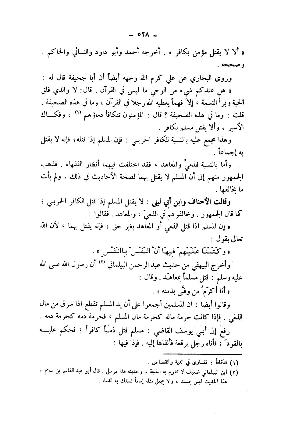 فذهب الجمهور منهم إلى أن المسلم لا يقتل بهما لصحة الاحاديث في ذلك، ولم يأت ما يخالفها.