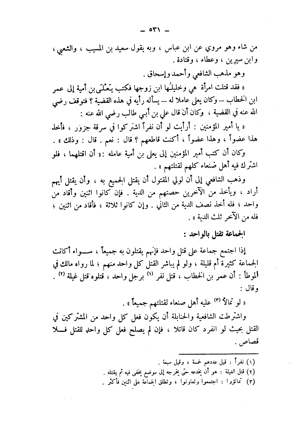 " فقد قتلت امرأة هي وخليلها ابن زوجها فكتب يعلى بن أمية إلى عمر ابن الخطاب - وكان يعلى عاملا له - يسأله رأيه في هذه القضية؟ فتوقف رضي الله عنه في القضية، وكان أن قال علي بن أبي طالب رضي الله عنه: " يا أمير المؤمنين: أرأيت لو أن نفرا اشتركوا في سرقة جزور، فأخذ هذا عضوا، وهذا عضوا، أكنت قاطعهم؟ قال: نعم. قال: وذلك ".