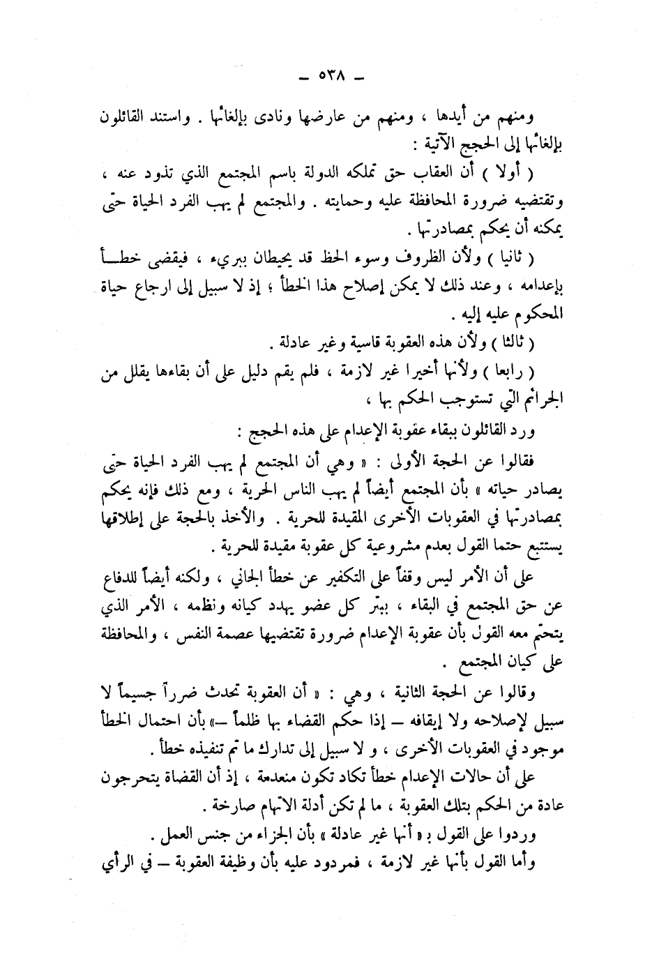 (رابعا) ولانها أخيرا غير لازمة، فلم يقم دليل على أن بقاءها يقلل من الجرائم التي تستوجب الحكم بها، ورد القائلون ببقاء عقوبة الاعدام على هذه الحجج: فقالوا عن الحجة الاولى: " وهي أن المجتمع لم يهب الفرد الحياة حتى يصادر حياته " بأن المجتمع أيضا لم يهب الناس الحرية، ومع ذلك فإنه يحكم بمصادرتها في العقوبات الاخرى المقيدة للحرية.