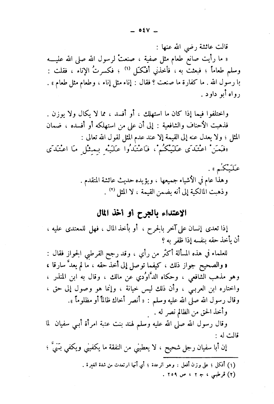 وذهبت المالكية إلى أنه يضمن القيمة، لا المثل (2) الاعتداء بالجرح أو أخذ المال إذا تعدى إنسان على آخر بالجرح، أو بأخذ المال، فهل للمعتدى عليه، أن يأخذ حقه بنفسه إذا ظفر به؟ للعلماء في هذه المسألة أكثر من رأي، وقد رجح القرطبي الجواز فقال: " والصحيح جواز ذلك، كيفما توصل إلى أخذ حقه، ما لم يعد سارقا، وهو مذهب الشافعي، وحكاه الداودي عن مالك، وقال به ابن المنذر، واختاره ابن العربي، وأن ذلك ليس خيانة، وإنما هو وصول إلى حق، وقال رسول الله صلى الله عليه وسلم: " أنصر أخاك ظالما أو مظلوما ".