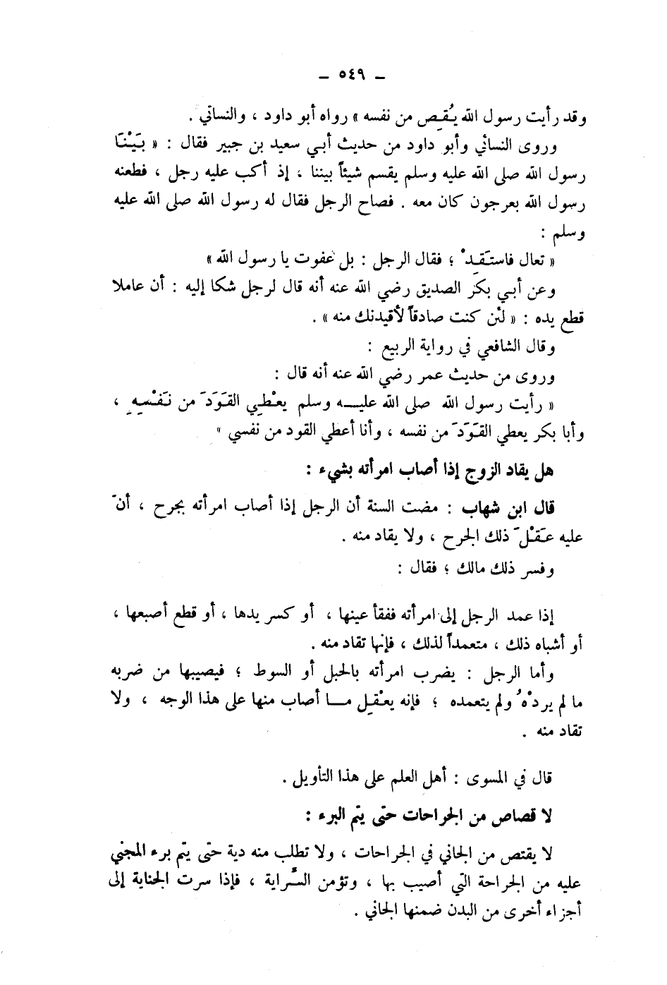 هل يقاد الزوج إذا أصاب امرأته بشئ: قال ابن شهاب: مضت السنة أن الرجل إذا أصاب امرأته بجرح، أن عليه عقل ذلك الجرح، ولا يقاد منه.