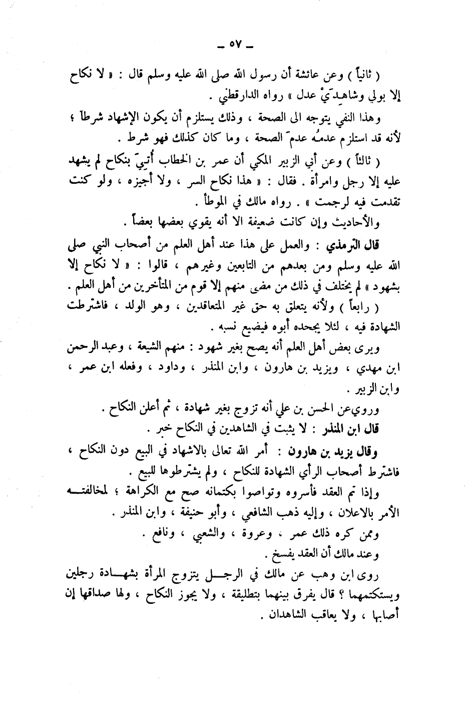 قال الترمذي: والعمل على هذا عند أهل العلم من أصحاب النبي صلى الله عليه وسلم ومن بعدهم من التابعين وغيرهم، قالوا: (لا نكاح إلا بشهود) لم يختلف في ذلك من مضى منهم إلا قوم من المتأخرين من أهل العلم.