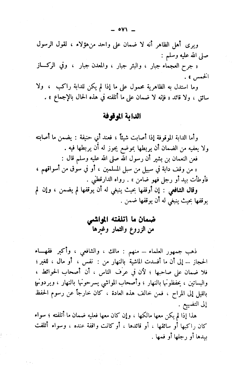 وما استدل به الظاهرية محمول على ما إذا لم يكن للدابة راكب، ولا سائق، ولا قائد " فإنه لا ضمان على ما أتلفته في هذه الحال بالاجماع ".
