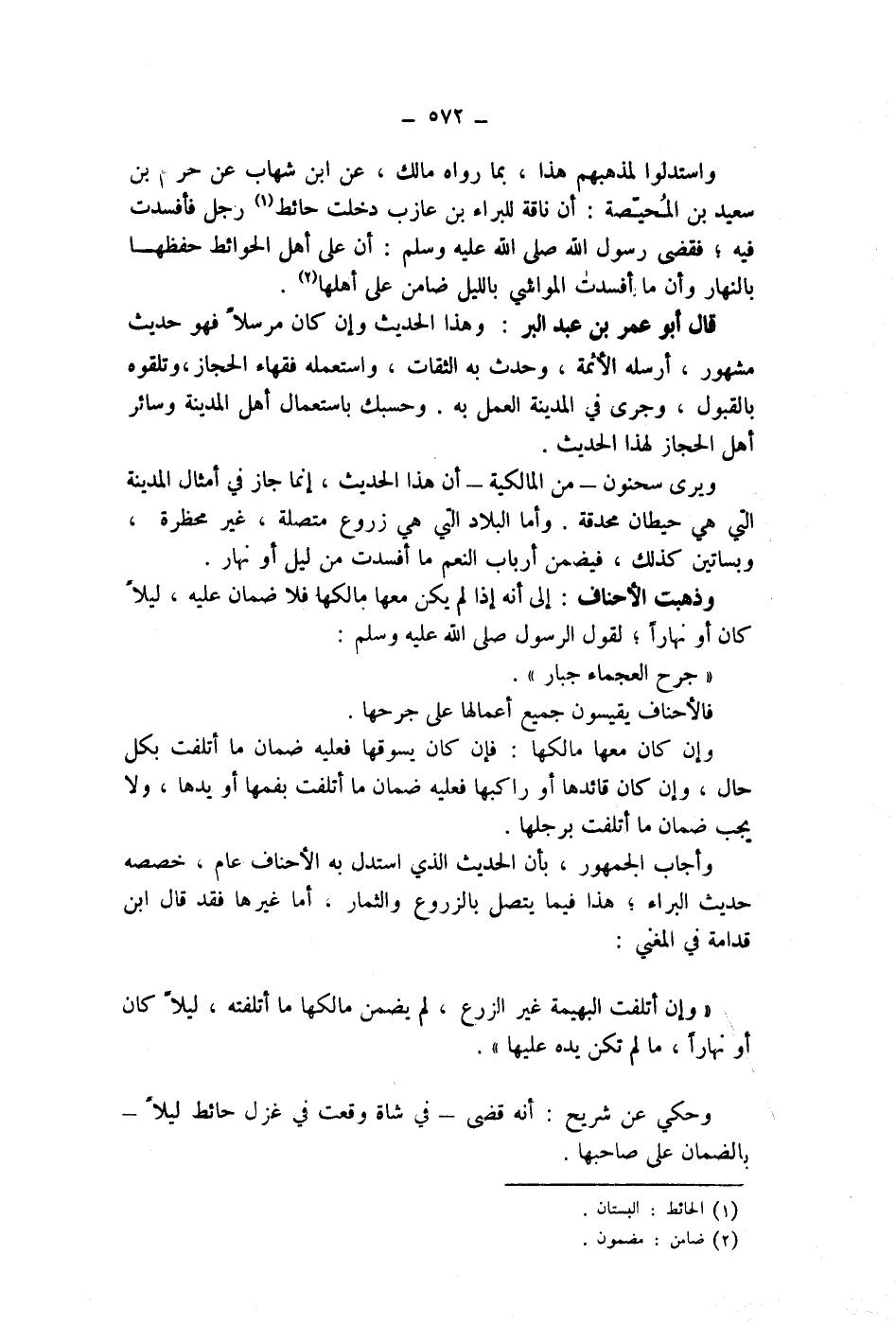 واستدلوا لمذهبهم هذا، بما رواه مالك، عن ابن شهاب عن حرام بن سعيد بن المحيصة: أن ناقة للبراء بن عازب دخلت حائط (1) رجل فأفسدت فيه، فقضى رسول الله صلى الله عليه وسلم: أن على أهل الحوائط حفظها بالنهار وأن ما أفسدت المواشي بالليل ضامن على أهلها (2) .