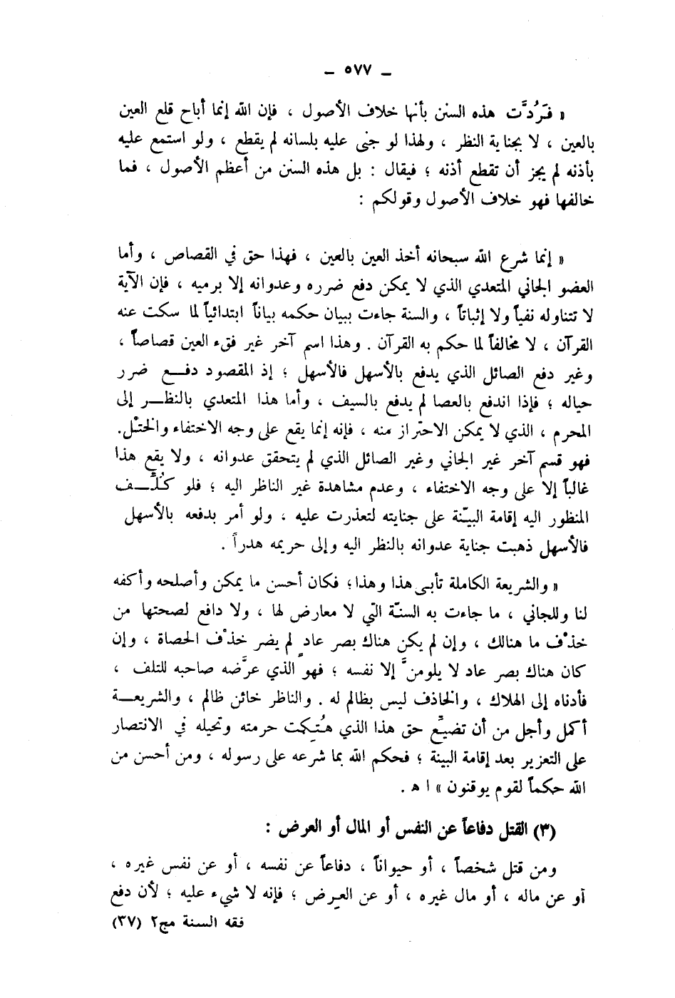 (3) القتل دفاعا عن النفس أو المال أو العرض: ومن قتل شخصا، أو حيوانا، دفاعا عن نفسه، أو عن نفس غيره، أو عن ماله، أو مال غيره، أو عن العرض، فإنه لاشئ عليه، لان دفع