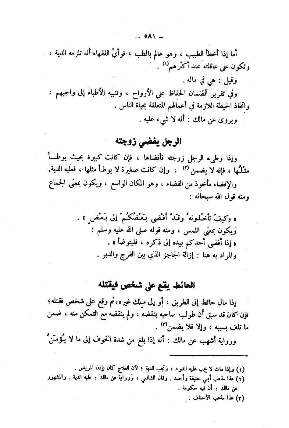 وإذا وطئ الرجل زوجته فأفضاها، فإن كانت كبيرة بحيث يوطأ مثلها، فإنه لا يضمن (2) ، وإن كانت صغيرة لا يوطأ مثلها، فعليه الدية.