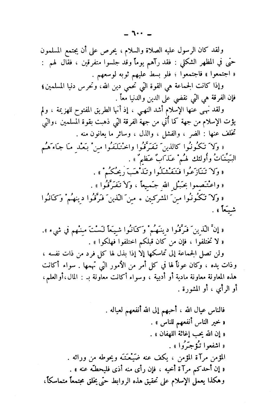 ولقد كان الرسول عليه الصلاة والسلام، يحرص على أن يجتمع المسلمون حتى في المظهر الشكلي: فقد رآهم يوما وقد جلسوا متفرقين، فقال لهم: " اجتمعوا " فاجتمعوا، فلو بسط عليهم ثوبه لوسعهم.