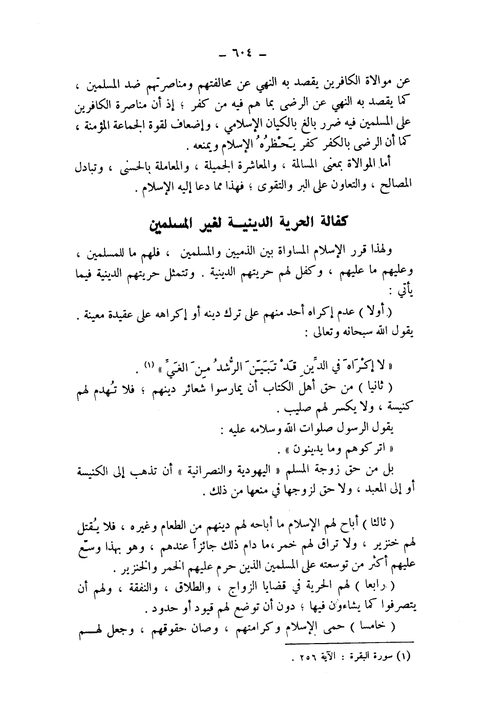 ولهذا قرر الاسلام المساواة بين الذميين والمسلمين، فلهم ما للمسلمين، وعليهم ما عليهم، وكفل لهم حريتهم الدينية.