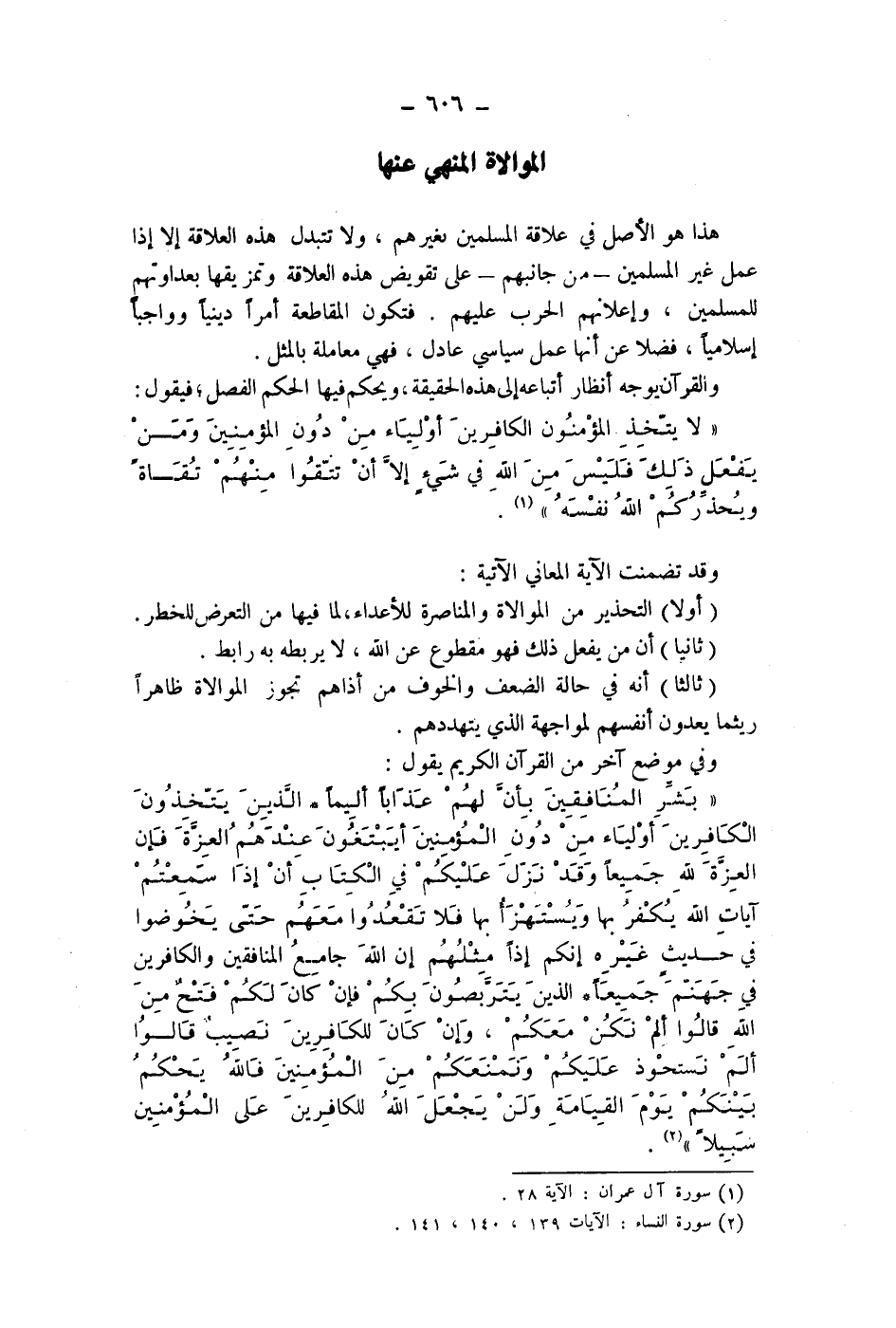 الموالاة المنهي عنها هذا هو الاصل في علاقة المسلمين بغيرهم، ولا تتبدل هذه العلاقة إلا إذا عمل غير المسلمين - من جانبهم - على تقويض هذه العلاقة وتمزيقها بعداوتهم للمسلمين، وإعلانهم الحرب عليهم.