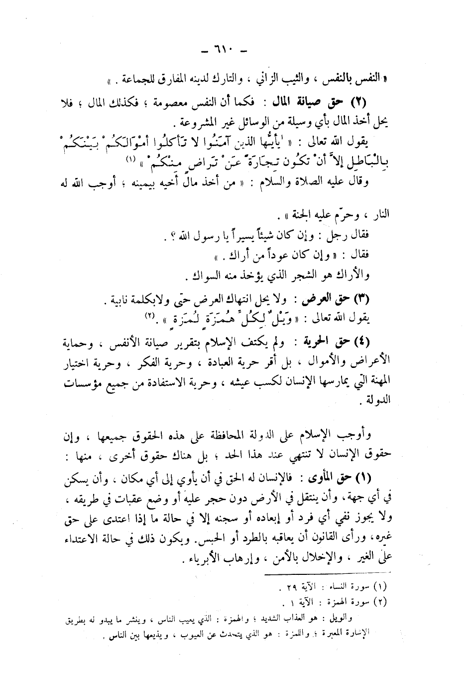 (4) حق الحرية: ولم يكتف الاسلام بتقرير صيانة الانفس، وحماية الاعراض والاموال، بل أقر حرية العبادة، وحرية الفكر، وحرية اختيار المهنة التي يمارسها الانسان لكسب عيشه، وحرية الاستفادة من جميع مؤسسات الدولة.