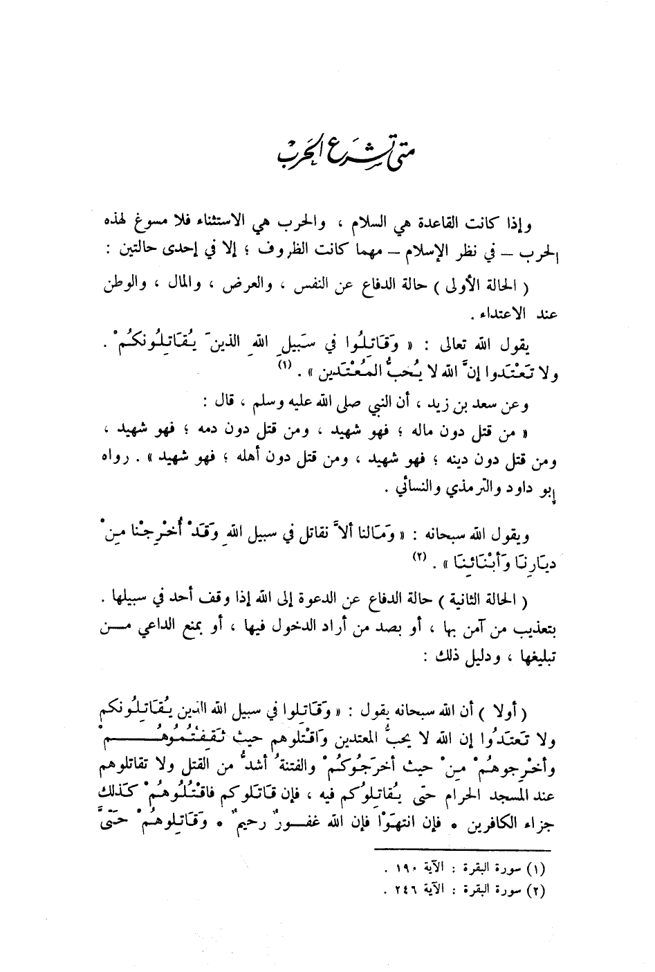 متى تشرع الحرب وإذا كانت القاعدة هي السلام، والحرب هي الاستثناء فلا مسوغ لهذه الحرب - في نظر الاسلام - مهما كانت الظروف، إلا في إحدى حالتين: (الحالة الاولى) حالة الدفاع عن النفس، والعرض، والمال، والوطن عند الاعتداء.