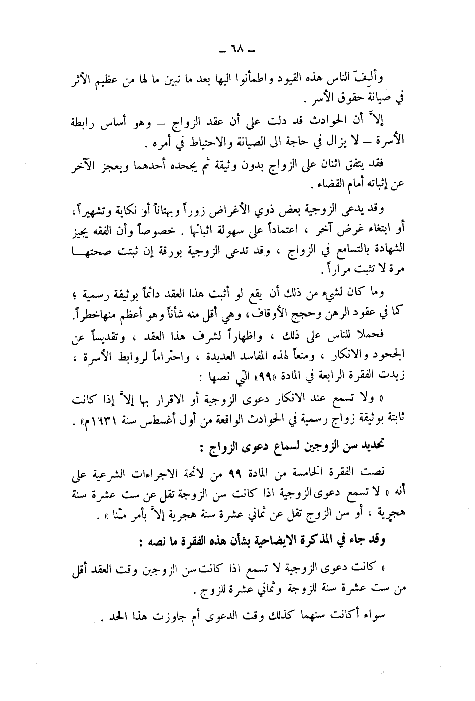فحملا للناس على ذلك، واظهارا لشرف هذا العقد، وتقديسا عن الجحود والانكار، ومنعا لهذه المفاسد العديدة، واحتراما لروابط الاسرة، زيدت الفقرة الرابعة في المادة " 99 " التي نصها: " ولا تسمع عند الانكار دعوى الزوجية أو الاقرار بها إلا إذا كانت ثابتة بوثيقة زواج رسمية في الحوادث الواقعة من أول أغسطس سنة 1931 م ".