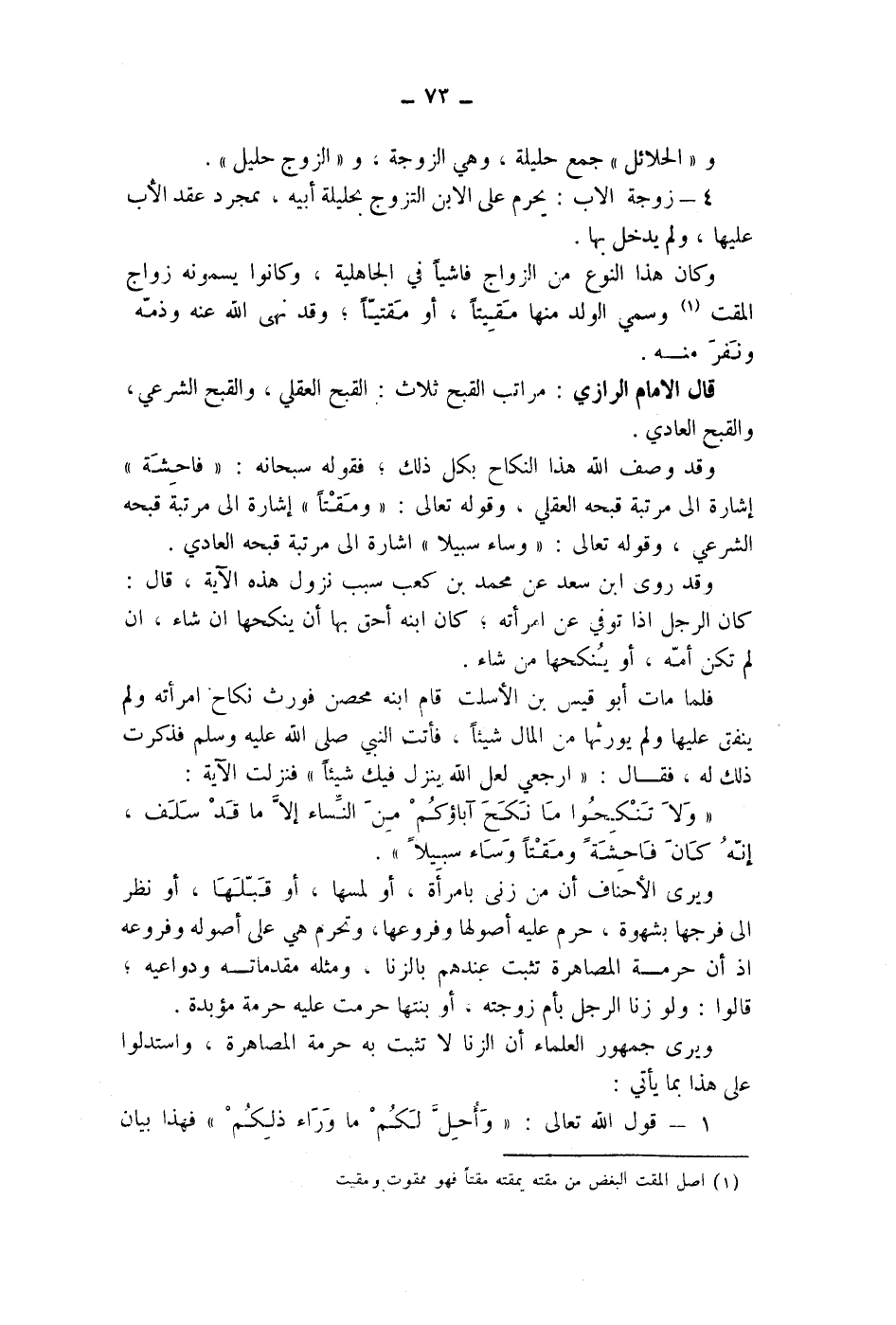 وقد وصف الله هذا النكاح بكل ذلك، فقوله سبحانه: " فاحشة " إشارة الى مرتبة قبحه العقلي، وقوله تعالى: " ومقتا " إشارة الى مرتبة قبحه الشرعي، وقوله تعالى: " وساء سبيلا " اشارة الى مرتبة قبحه العادي.