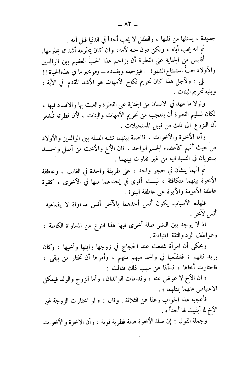 ثم انهما ينشآن في حجر واحد، على طريقة واحدة في الغالب، وعاطفة الاخوة بينهما متكافئة، ليست أقوى في إحداهما منها في الاخرى، كقوة عاطفة الامومة والابوة على عاطفة البنوة.