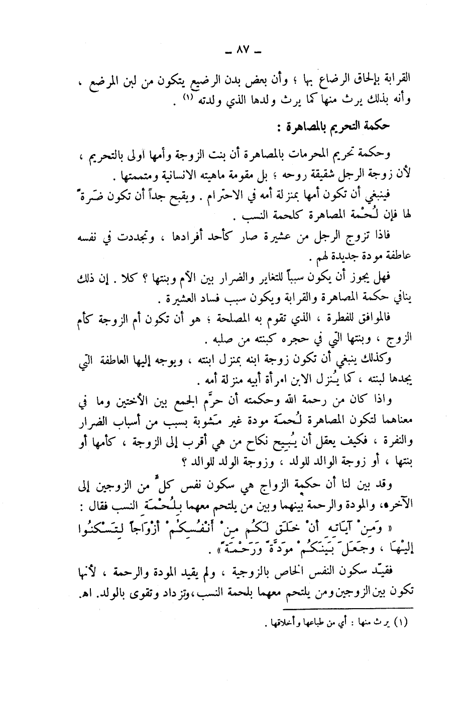وإذا كان من رحمة الله وحكمته أن حرم الجمع بين الاختين وما في معناهما لتكون المصاهرة لحمة مودة غير مشوبة بسبب من أسباب الضرار والنفرة، فكيف يعقل أن يبيح نكاح من هي أقرب إلى الزوجة، كأمها أو بنتها، أو زوجة الوالد للولد، وزوجة الولد للوالد؟ وقد بين لنا أن حكمة الزواج هي سكون نفس كل من الزوجين إلى الآخره، والمودة والرحمة بينهما وبين من يلتحم معهما بلحمة النسب فقال: " ومن آياته أن خلق لكم من أنفسكم أزواجا لتسكنوا إليها، وجعل بينكم مودة ورحمة ".