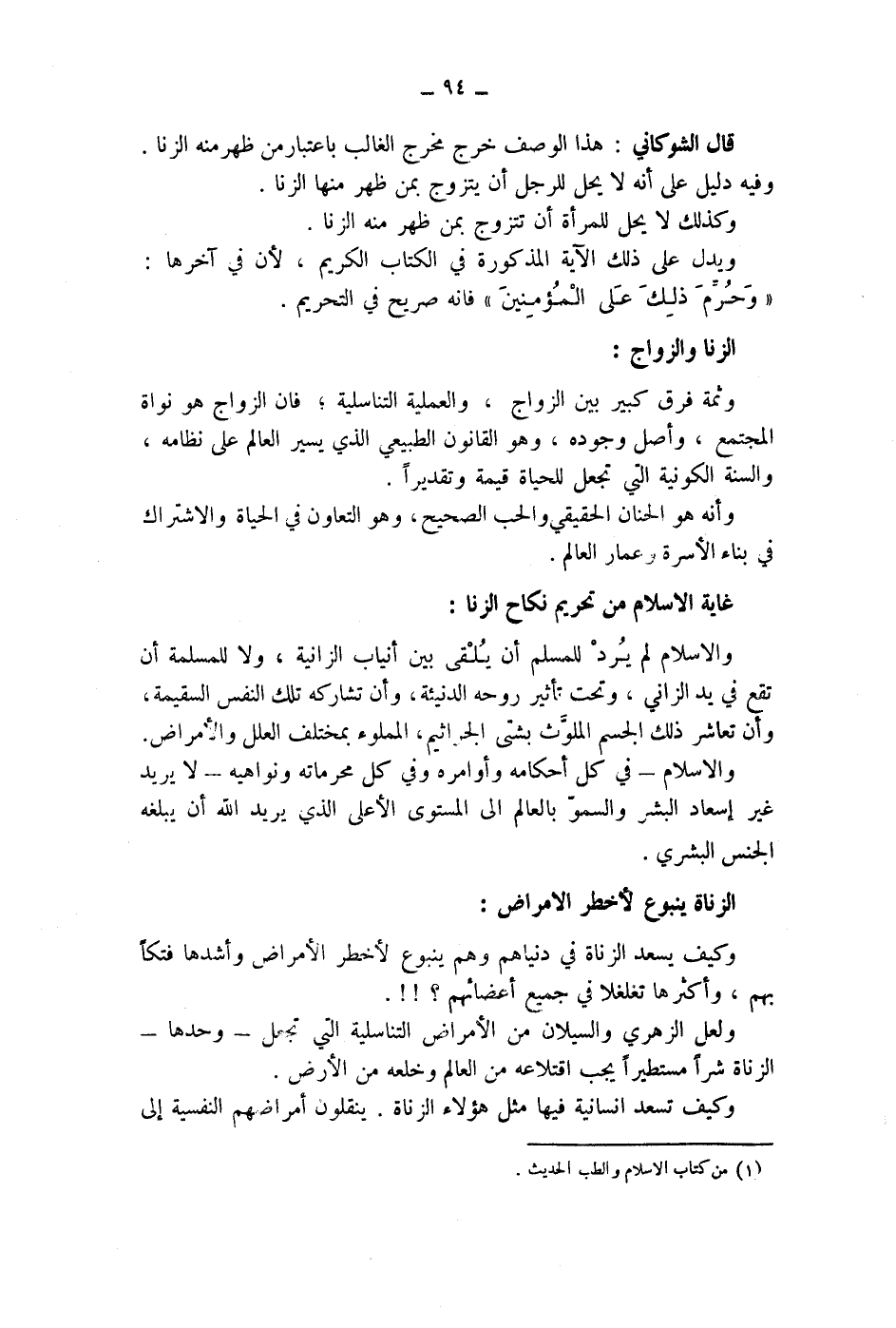 غاية الاسلام من تحريم نكاح الزنا: والاسلام لم يرد للمسلم أن يلقى بين أنياب الزانية، ولا للمسلمة أن تقع في يد الزاني، وتحت تأثير روحه الدنيئة، وأن تشاركه تلك النفس السقيمة، وأن تعاشر ذلك الجسم الملوث بشتى الجراثيم، المملوء بمختلف العلل والامراض.