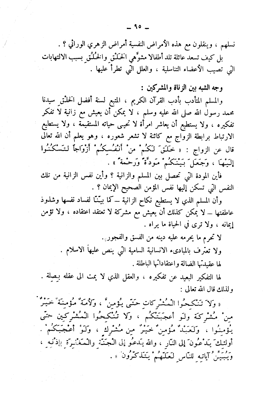 وجه الشبه بين الزناة والمشركين: والمسلم المتأدب بأدب القرآن الكريم، المتبع لسنة أفضل الخلق سيدنا محمد رسول الله صلى الله عليه وسلم، لا يمكن أن يعيش مع زانية لا تفكر تفكيره، ولا يستطيع أن يعاشر امرأة لاتحيى حياته المستقيمة، ولا يستطيع الارتباط برابطة الزواج مع كائنة لا تشعر شعوره، وهو يعلم أن الله تعالى قال عن الزواج: " خلق لكم من أنفسكم أزواجا لتسكنوا إليها، وجعل بينكم مودة ورحمة ".