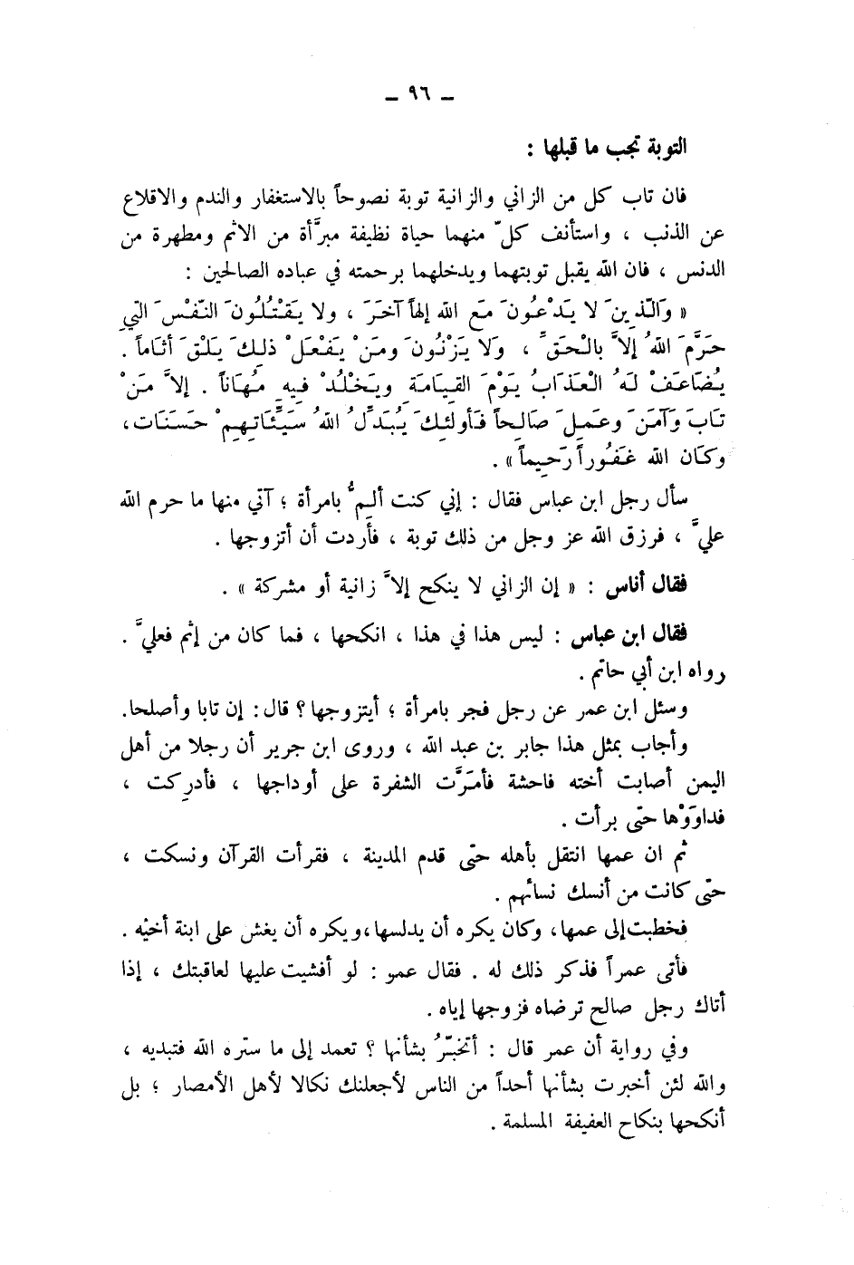 وأجاب بمثل هذا جابر بن عبد الله، وروى ابن جرير أن رجلا من أهل اليمن أصابت أخته فاحشة فأمرت الشفرة على أوداجها، فأدركت، فداووها حتى برأت. ثم ان عمها انتقل بأهله حتى قدم المدينة، فقرأت القرآن ونسكت، حتى كانت من أنسك نسائهم.