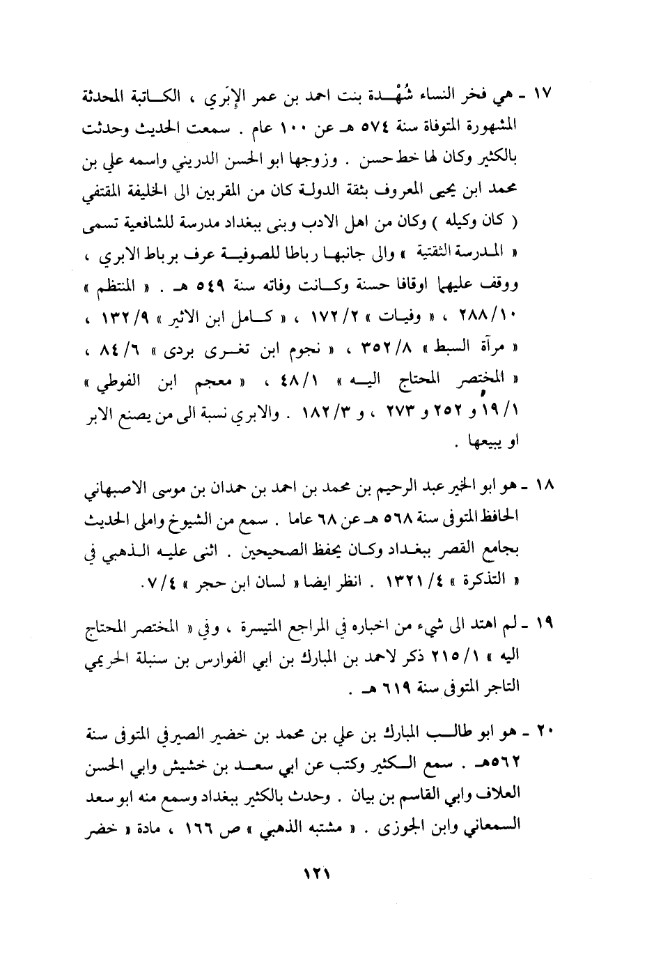 17- هي فخر النساء شهدة بنت احمد بن عمر الإبري، الكاتبة المحدثة المشهورة المتوفاة سنة 574 هـ عن 100 عام. سمعت الحديث وحدثت بالكثير وكان لها خط حسن. وزوجها ابو الحسن الدريني واسمه علي بن محمد ابن يحيى المعروف بثقة الدولة كان من المقربين الى الخليفة المقتفي (كان وكيله) وكان من اهل الادب وبنى ببغداد مدرسة للشافعية تسمى «المدرسة الثقتية» والى جانبها رباطا للصوفية عرف برباط الابري، ووقف عليهما اوقافا حسنة وكانت وفاته سنة 549 هـ. «المنتظم» 10/288، «وفيات» 2/172، «كامل ابن الاثير» 9/132، «مرآة السبط» 8/352، «نجوم ابن تغرى بردى» 6/84، «المختصر المحتاج اليه» 1/48، «معجم ابن الفوطي» 1/19 و 252 و 273، و 3/182. والابري نسبة الى من يصنع الابر او يبيعها.
