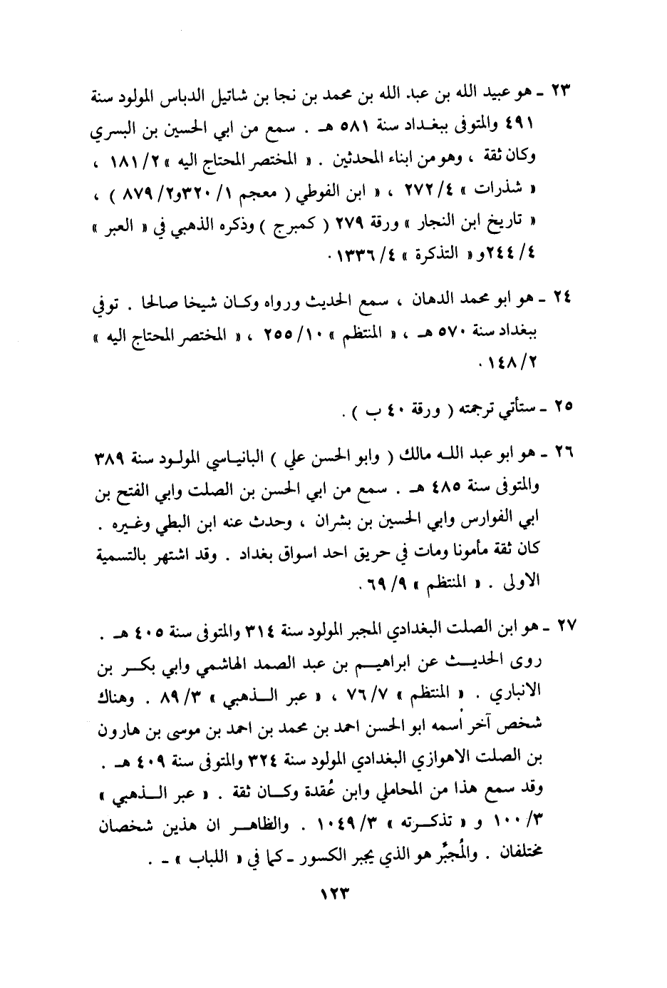 23- هو عبيد الله بن عبد اللَّهِ بْنُ مُحَمَّدِ بْنِ نَجَا بْنِ شَاتِيلَ الدباس المولود سنة 491 والمتوفى ببغداد سنة 581 هـ. سمع من ابي الحسين بن البسري وكان ثقة، وهو من ابناء المحدثين. «المختصر المحتاج اليه» 2/181، «شذرات» 4/272، «ابن الفوطي (معجم 1/320 و 2/879) ، «تاريخ ابن النجار» ورقة 279 (كمبرج) وذكره الذهبي في «العبر» 4/244 و «التذكرة» 4/1336.