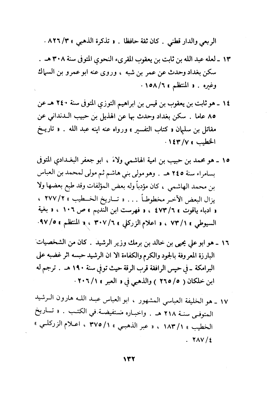 15- هو محمد بن حبيب بن امية الهاشمي ولاء، ابو جعفر البغدادي المتوفى بسامراء سنة 245 هـ. وهو مولى بني هاشم ثم مولى لمحمد بن العباس بن محمد الهاشمي، كان مؤدبا وله بعض المؤلفات وقد طبع بعضها ولا يزال البعض الآخر مخطوطا ... «تاريخ الخطيب» 2/277، «ادباء ياقوت» 6/473، «فهرست ابن النديم» ص 106، «بغية السيوطي» 1/73، «اعلام الزركلي» 6/307، «المنتظم» 5/97.