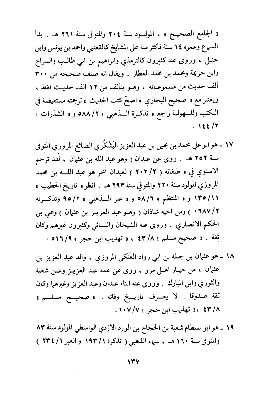 «الجامع الصحيح» ، المولود سنة 204 والمتوفى سنة 261 هـ. بدأ السماع وعمره 14 سنة فأكثر منه على المشايخ كالقعنبي واحمد بن يونس وابن حنبل، وروى عنه كثيرون كالترمذي وابراهيم بن ابي طالب والسراج وابن خزيمة ومحمد بن مخلد العطار. ويقال انه صنف صحيحه من 300 ألف حديث من مسموعاته، وهو يتألف من 12 الف حديث فقط، ويعتبر مع «صحيح البخاري» اصحّ كتب الحديث» ترجمته مستفيضة في الكتب وللسهولة راجع «تذكرة الذهبي» 2/588 و «الشذرات» 2/144.