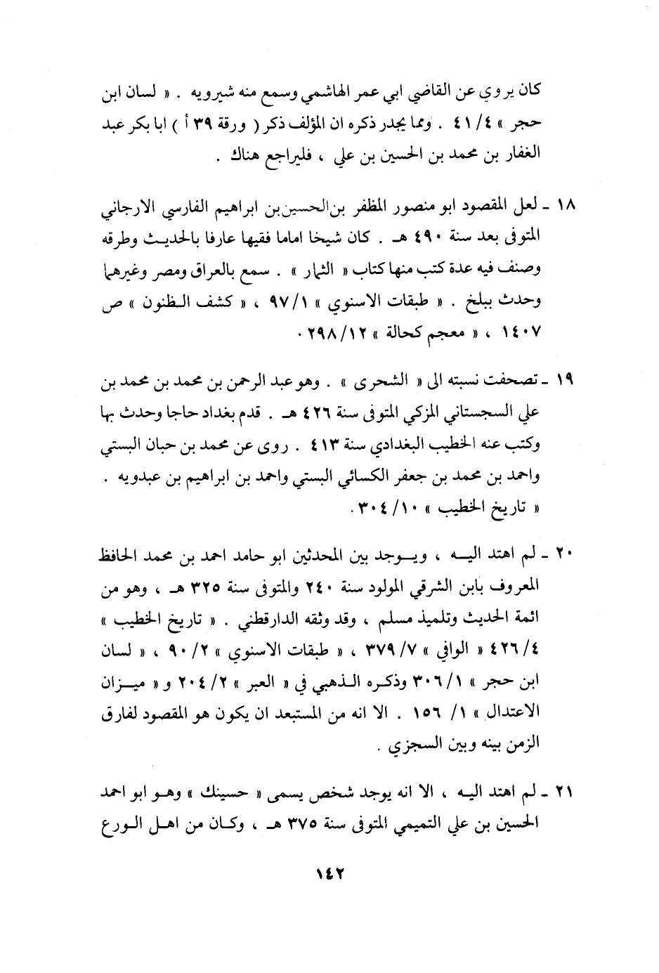 20- لم اهتد اليه، ويوجد بين المحدثين ابو حامد احمد بن محمد الحافظ المعروف بابن الشرقي المولود سنة 240 والمتوفى سنة 325 هـ، وهو من ائمة الحديث وتلميذ مسلم، وقد وثقه الدارقطني. «تاريخ الخطيب» 4/426 «الوافي» 7/379، «طبقات الاسنوي» 2/90، «لسان ابن حجر» 1/306 وذكره الذهبي في «العبر» 2/204 و «ميزان الاعتدال» 1/156. الا انه من المستبعد ان يكون هو المقصود لفارق الزمن بينه وبين السجزي.