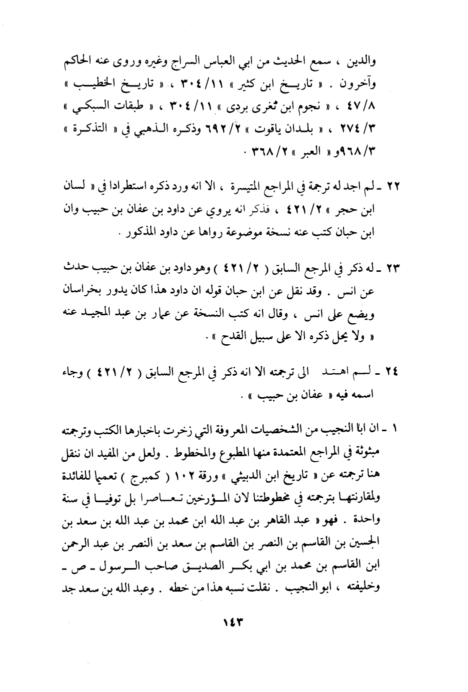 24- لم اهتد الى ترجمته الا انه ذكر في المرجع السابق (2/421) وجاء اسمه فيه «عفان بن حبيب» .