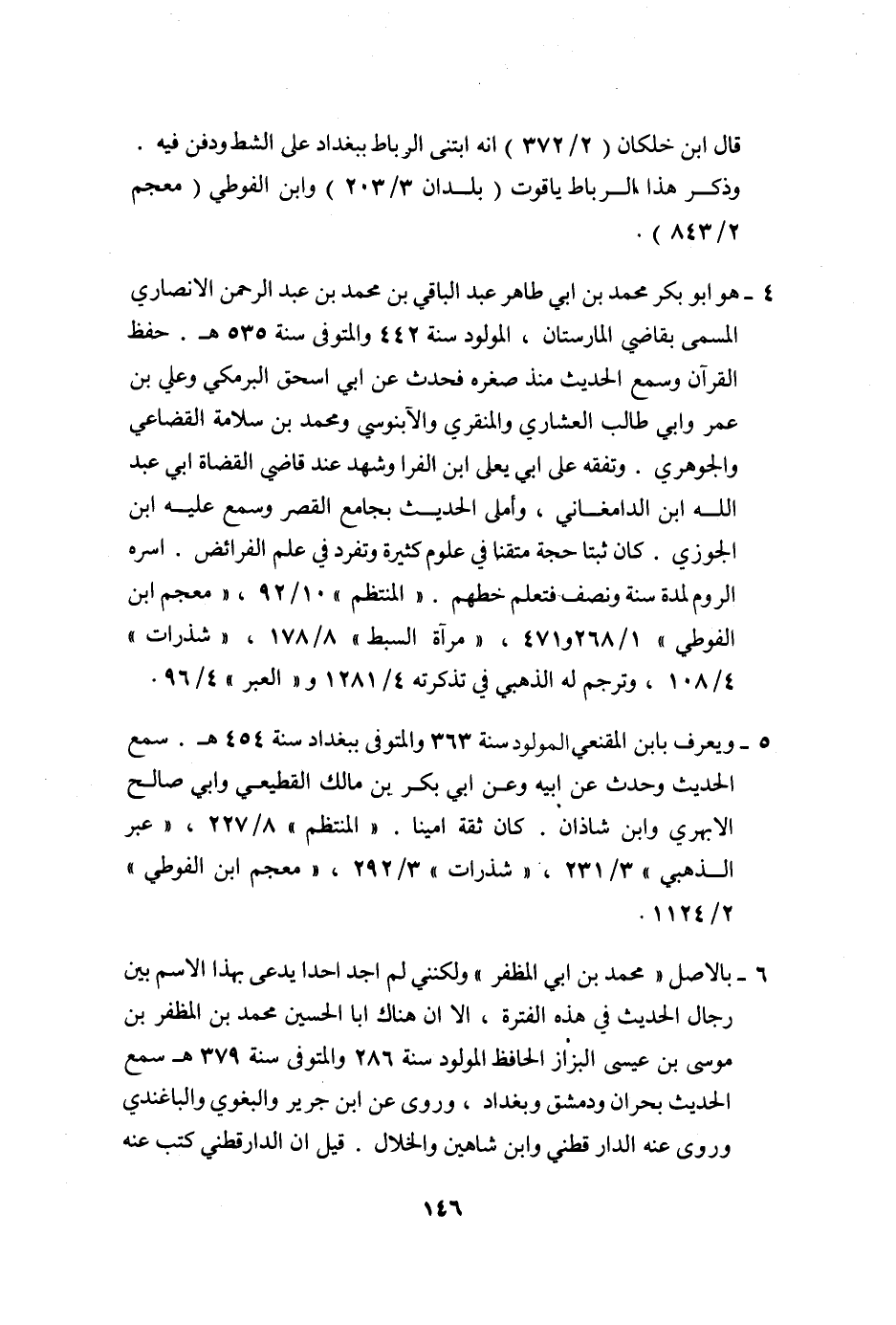 6- بالاصل «محمد بن ابي المظفر» ولكنني لم اجد احدا يدعى بهذا الاسم بين رجال الحديث في هذه الفترة، الا ان هناك ابا الحسين محمد بن المظفر بن موسى بن عيسى البزاز الحافظ المولود سنة 286 والمتوفى سنة 379 هـ سمع الحديث بحران ودمشق وبغداد، وروى عن ابن جرير والبغوي والباغندي وروى عنه الدارقطني وابن شاهين والخلال. قيل ان الدارقطني كتب عنه