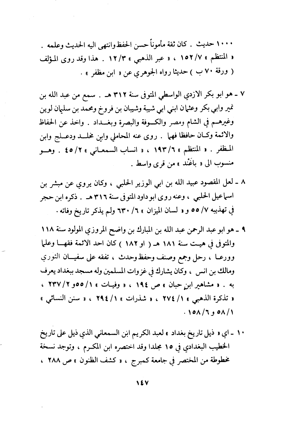 10- اي «ذيل تاريخ بغداد» لعبد الكريم ابن السمعاني الذي ذيل على تاريخ الخطيب البغدادي في 15 مجلدا وقد اختصره ابن المكرم، وتوجد نسخة مخطوطة من المختصر في جامعة كمبرج، «كشف الظنون» ص 288،