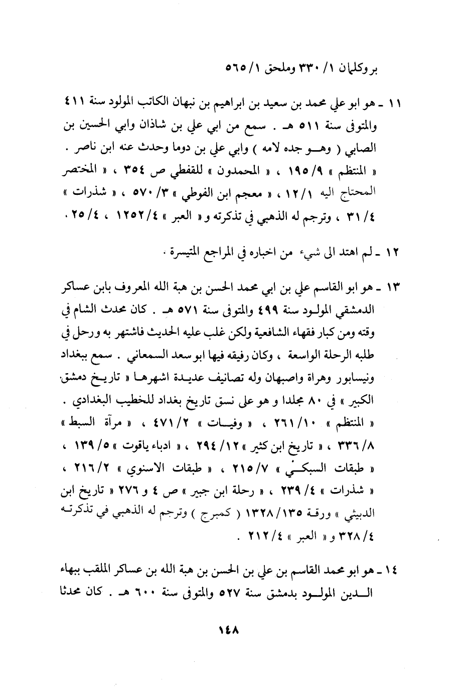 13- هو ابو القاسم علي بْن أَبِي مُحَمَّد الْحَسَن بْن هِبَة اللَّه المعروف بابن عساكر الدمشقي المولود سنة 499 والمتوفى سنة 571 هـ. كان محدث الشام في وقته ومن كبار فقهاء الشافعية ولكن غلب عليه الحديث فاشتهر به ورحل في طلبه الرحلة الواسعة، وكان رفيقه فيها ابو سعد السمعاني. سمع ببغداد ونيسابور وهراة واصبهان وله تصانيف عديدة اشهرها «تاريخ دمشق الكبير» في 80 مجلدا وهو على نسق تاريخ بغداد للخطيب البغدادي.