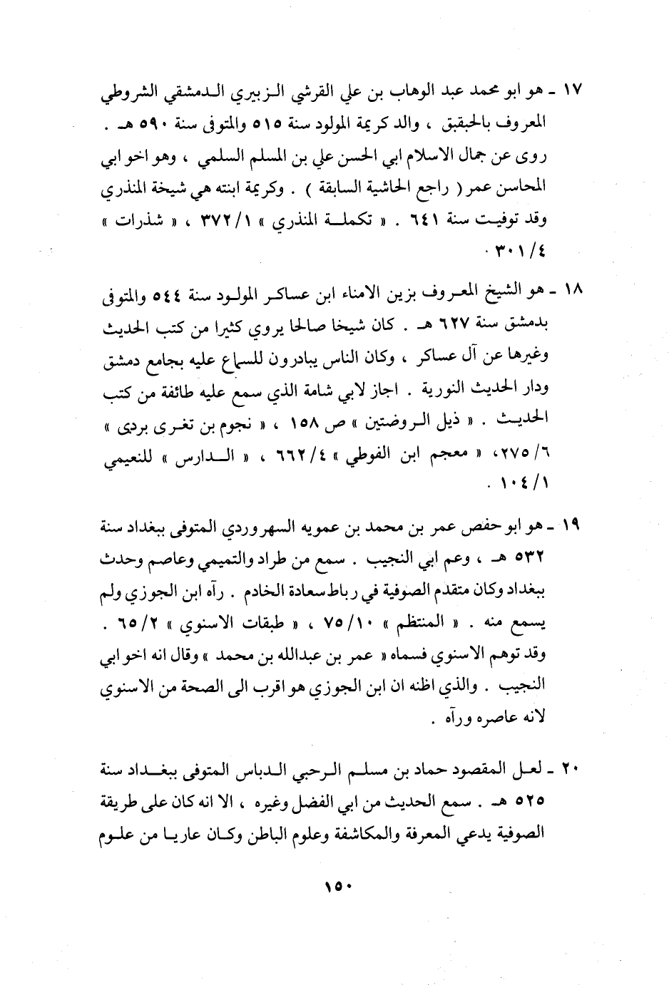 20- لعل المقصود حماد بن مسلم الرحبي الدباس المتوفى ببغداد سنة 525 هـ. سمع الحديث من ابي الفضل وغيره، الا انه كان على طريقة الصوفية يدعي المعرفة والمكاشفة وعلوم الباطن وكان عاريا من علوم