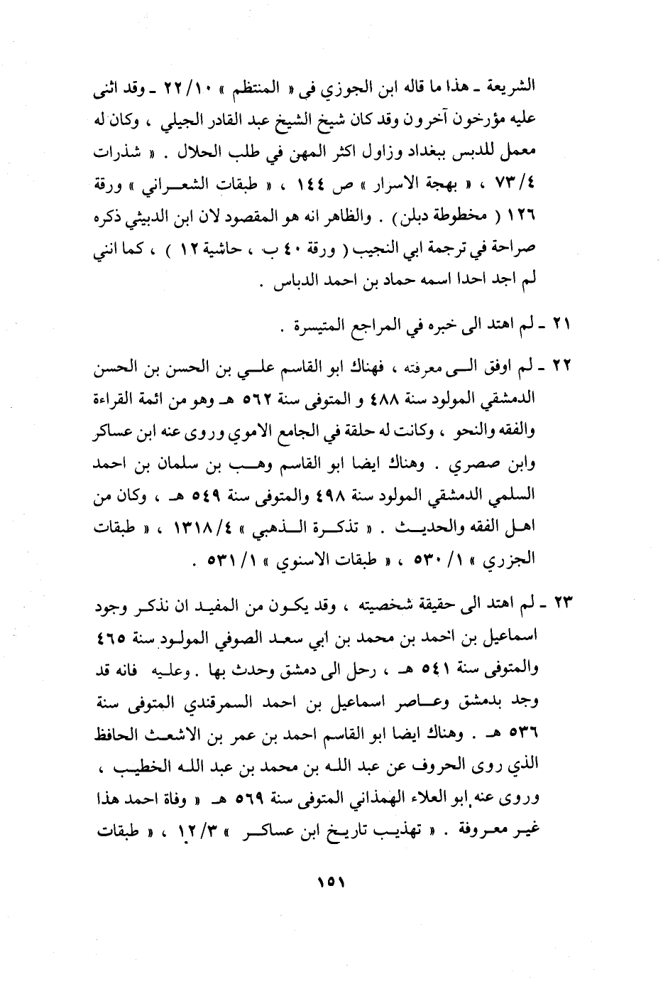 الشريعة- هذا ما قاله ابن الجوزي فى «المنتظم» 10/22- وقد اثنى عليه مؤرخون آخرون وقد كان شيخ الشيخ عبد القادر الجيلي، وكان له معمل للدبس ببغداد وزاول اكثر المهن في طلب الحلال. «شذرات 4/73، «بهجة الاسرار» ص 144، «طبقات الشعراني» ورقة 126 (مخطوطة دبلن) . والظاهر انه هو المقصود لان ابن الدبيثي ذكره صراحة في ترجمة ابي النجيب (ورقة 40 ب، حاشية 12) ، كما انني لم اجد احدا اسمه حماد بن احمد الدباس.