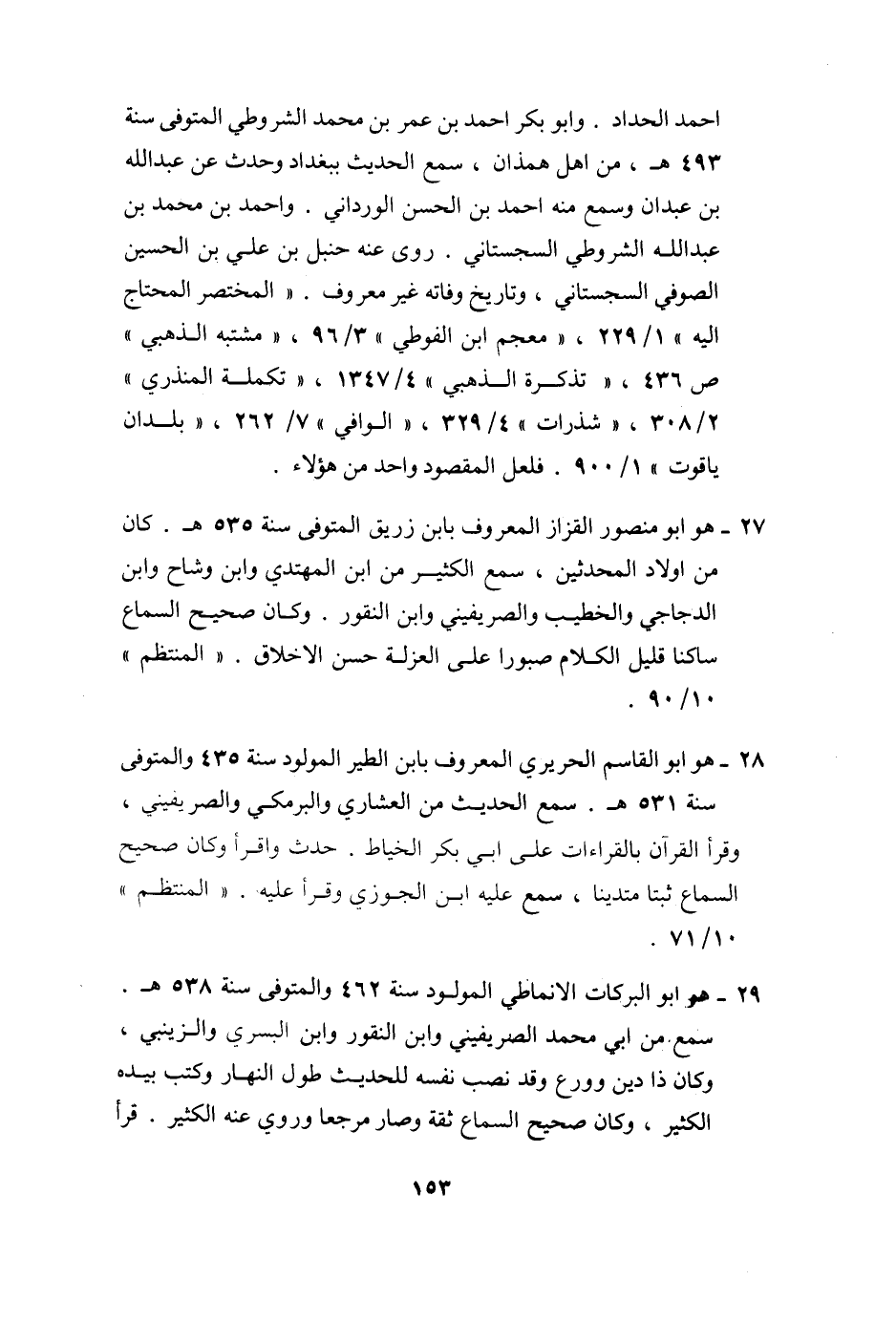 28- هو ابو القاسم الحريري المعروف بابن الطير المولود سنة 435 والمتوفى سنة 531 هـ. سمع الحديث من العشاري والبرمكي والصريفيني، وقرأ القرآن بالقراءات على ابي بكر الخياط. حدث واقرأ وكان صحيح السماع ثبتا متدينا، سمع عليه ابن الجوزي وقرأ عليه. «المنتظم» 10/71.