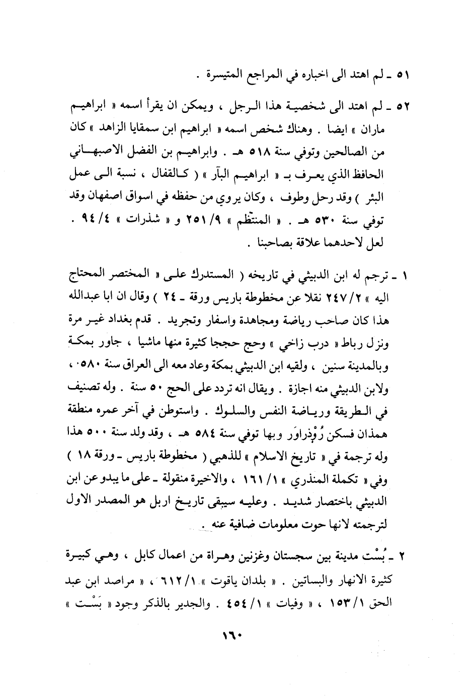 52- لم اهتد الى شخصية هذا الرجل، ويمكن ان يقرأ اسمه «ابراهيم ماران» ايضا. وهناك شخص اسمه «ابراهيم ابن سمقايا الزاهد» كان من الصالحين وتوفي سنة 518 هـ. وابراهيم بن الفضل الاصبهاني الحافظ الذي يعرف ب «ابراهيم البآر» (كالقفال، نسبة الى عمل البئر) وقد رحل وطوف، وكان يروي من حفظه في اسواق اصفهان وقد توفي سنة 530 هـ. «المنتظم» 9/251 و «شذرات» 4/94.