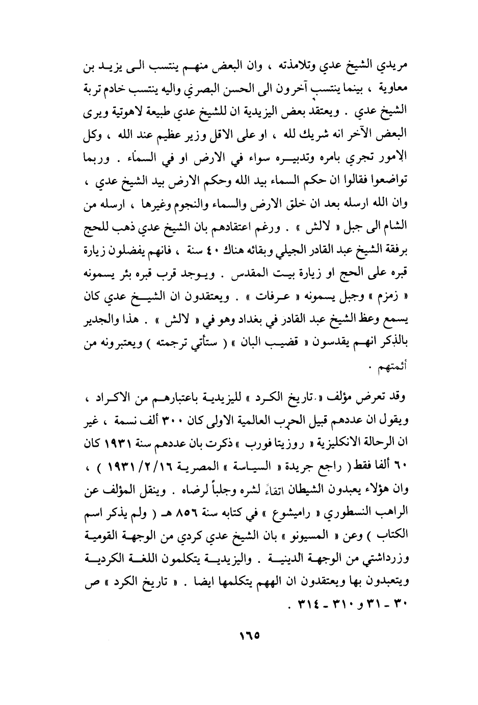 وقد تعرض مؤلف «تاريخ الكرد» لليزيدية باعتبارهم من الاكراد، ويقول ان عددهم قبيل الحرب العالمية الاولى كان 300 ألف نسمة، غير ان الرحالة الانكليزية «روزيتا فورب» ذكرت بان عددهم سنة 1931 كان 60 ألفا فقط (راجع جريدة «السياسة» المصرية 16/2/1931) ، وان هؤلاء يعبدون الشيطان اتقاء لشره وجلبا لرضاه. وينقل المؤلف عن الراهب النسطوري «راميشوع» في كتابه سنة 856 هـ (ولم يذكر اسم الكتاب) وعن «المسيونو» بان الشيخ عدي كردي من الوجهة القومية وزرداشتي من الوجهة الدينية. واليزيدية يتكلمون اللغة الكردية ويتعبدون بها ويعتقدون ان الههم يتكلمها ايضا. «تاريخ الكرد» ص 30- 31 و 310- 314.