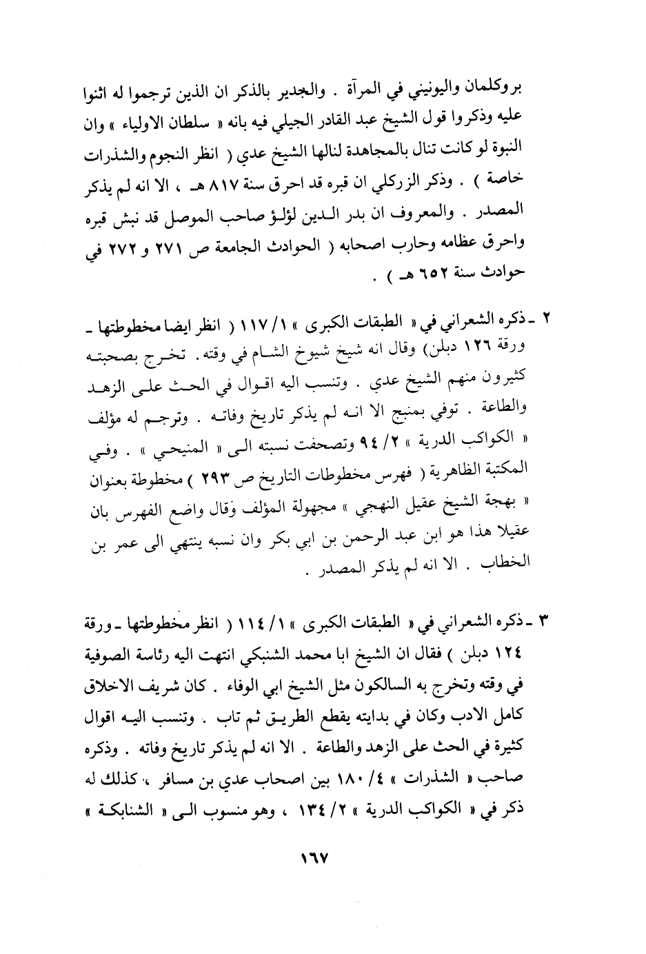 2- ذكره الشعراني في «الطبقات الكبرى» 1/117 (انظر ايضا مخطوطتها- ورقة 126 دبلن) وقال انه شيخ شيوخ الشام في وقته. تخرج بصحبته كثيرون منهم الشيخ عدي. وتنسب اليه اقوال في الحث على الزهد والطاعة. توفي بمنبج الا انه لم يذكر تاريخ وفاته. وترجم له مؤلف «الكواكب الدرية» 2/94 وتصحفت نسبته الى «المنيحي» . وفي المكتبة الظاهرية (فهرس مخطوطات التاريخ ص 293) مخطوطة بعنوان «بهجة الشيخ عقيل النهجي» مجهولة المؤلف وقال واضع الفهرس بان عقيلا هذا هو ابن عبد الرحمن بن ابي بكر وان نسبه ينتهي الى عمر بن الخطاب. الا انه لم يذكر المصدر.