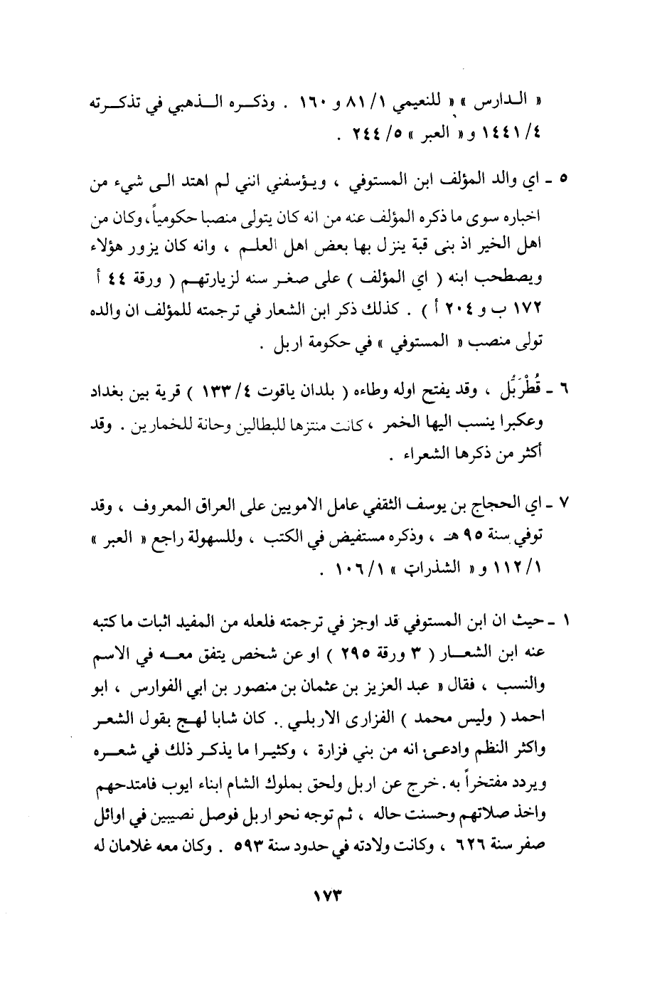5- اي والد المؤلف ابن المستوفي، ويؤسفني انني لم اهتد الى شيء من اخباره سوى ما ذكره المؤلف عنه من انه كان يتولى منصبا حكوميا، وكان من اهل الخير اذ بنى قبة ينزل بها بعض اهل العلم، وانه كان يزور هؤلاء ويصطحب ابنه (اي المؤلف) على صغر سنه لزيارتهم (ورقة 44 أ 172 ب و 204 أ) . كذلك ذكر ابن الشعار في ترجمته للمؤلف ان والده تولى منصب «المستوفي» في حكومة اربل.