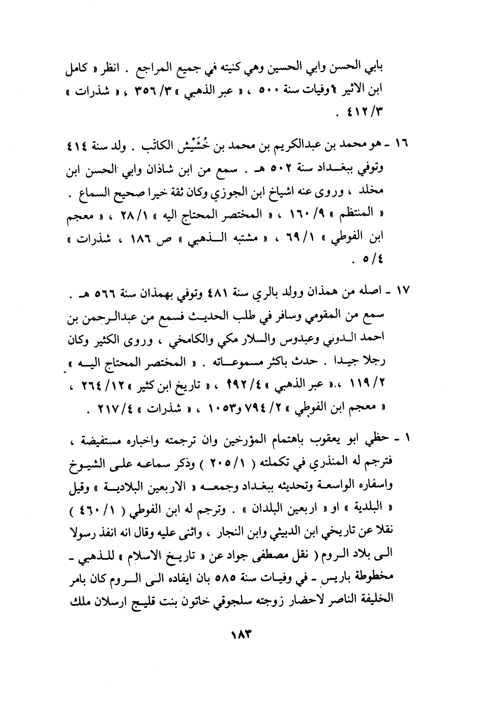16- هو محمد بن عبد الكريم بن محمد بن خشيش الكاتب. ولد سنة 414 وتوفي ببغداد سنة 502 هـ. سمع من ابن شاذان وابي الحسن ابن مخلد، وروى عنه اشياخ ابن الجوزي وكان ثقة خيرا صحيح السماع.