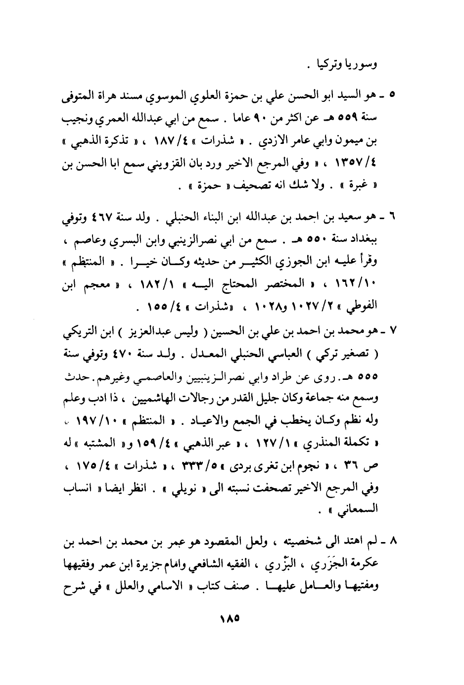 5- هو السيد ابو الحسن علي بن حمزة العلوي الموسوي مسند هراة المتوفى سنة 559 هـ عن اكثر من 90 عاما. سمع من ابي عبد الله العمري ونجيب بن ميمون وابي عامر الازدي. «شذرات» 4/187، «تذكرة الذهبي» 4/1357، «وفي المرجع الاخير ورد بان القزويني سمع ابا الحسن بن «غبرة» . ولا شك انه تصحيف «حمزة» .