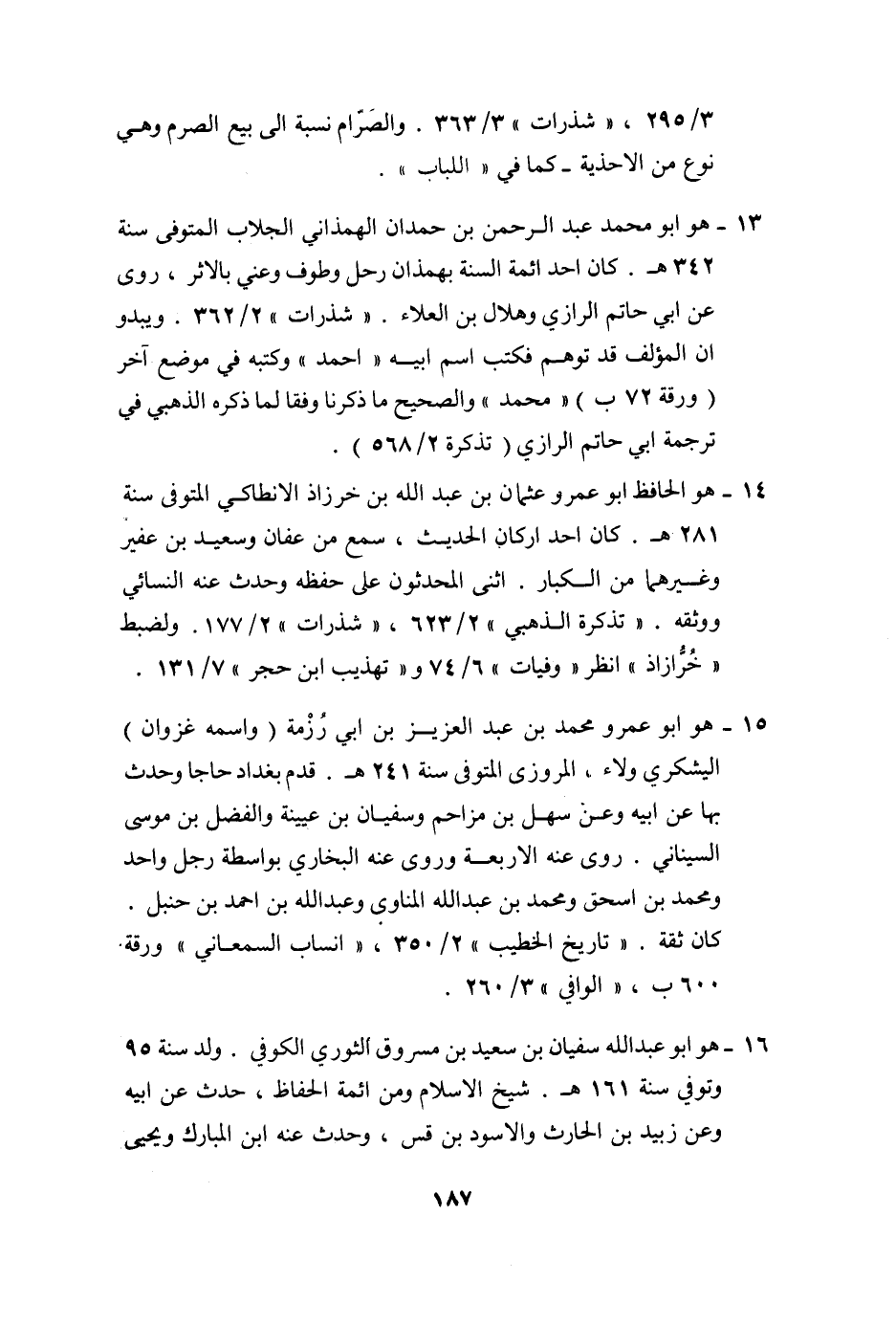 13- هو ابو محمد عبد الرحمن بن حمدان الهمذاني الجلاب المتوفى سنة 342 هـ. كان احد ائمة السنة بهمذان رحل وطوف وعني بالاثر، روى عن ابي حاتم الرازي وهلال بن العلاء. «شذرات» 2/362. ويبدو ان المؤلف قد توهم فكتب اسم ابيه «احمد» وكتبه في موضع آخر (ورقة 72 ب) «محمد» والصحيح ما ذكرنا وفقا لما ذكره الذهبي في ترجمة ابي حاتم الرازي (تذكرة 2/568) .