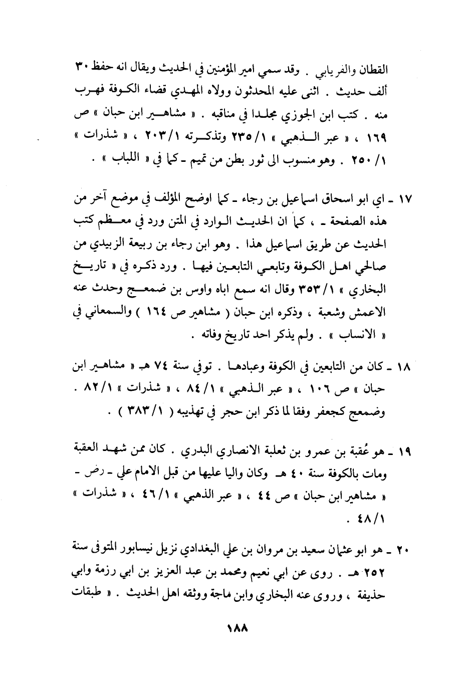 17- اي ابو اسحاق اسماعيل بن رجاء- كما اوضح المؤلف في موضع آخر من هذه الصفحة-، كما ان الحديث الوارد في المتن ورد في معظم كتب الحديث عن طريق اسماعيل هذا. وهو ابن رجاء بن ربيعة الزبيدي من صالحي اهل الكوفة وتابعي التابعين فيها. ورد ذكره في «تاريخ البخاري» 1/353 وقال انه سمع اباه واوس بن ضمعج وحدث عنه الاعمش وشعبة، وذكره ابن حبان (مشاهير ص 164) والسمعاني في «الانساب» . ولم يذكر احد تاريخ وفاته.