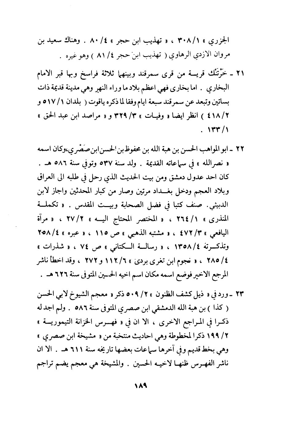 23- ورد في «ذيل كشف الظنون» 2/509 ذكر «معجم الشيوخ لابي الحسن (كذا) بن هبة الله الدمشقي ابن صصري المتوفى سنة 586. ولم اجد له ذكرا في المراجع الاخرى، الا ان في «فهرس الخزانة التيمورية» 2/199 ذكرا لمخطوطة وهي احاديث منتخبة من «مشيخة ابن صصري» وهي بخط قديم وفي آخرها سماعات بعضها تاريخه سنة 611 هـ. الا ان ناشر الفهرس ظنها لاخيه الحسين. والمشيخة هي معجم يضم تراجم
