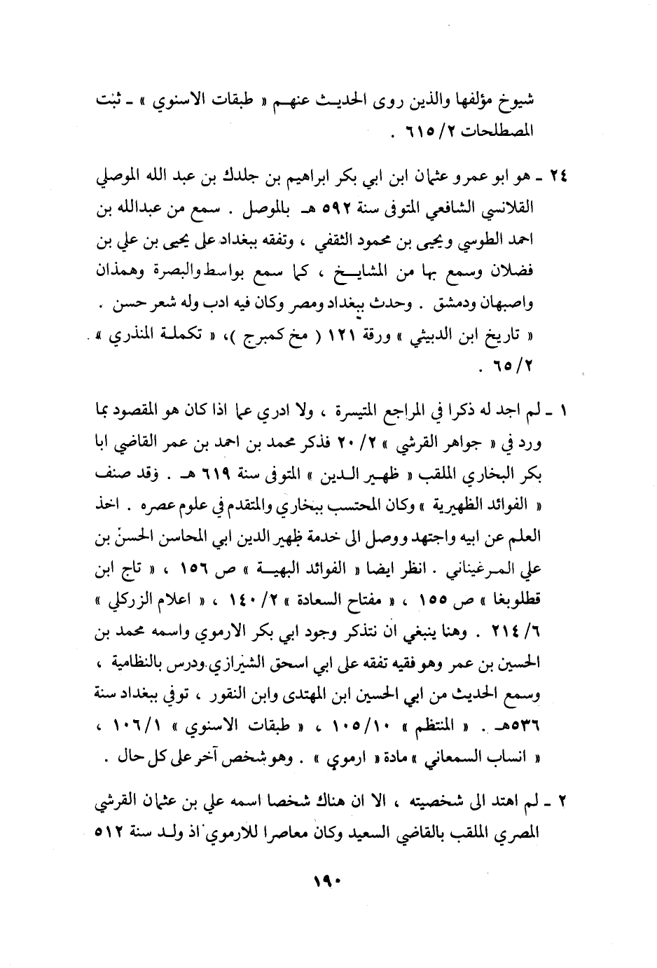 1- لم اجد له ذكرا في المراجع المتيسرة، ولا ادري عما اذا كان هو المقصود بما ورد في «جواهر القرشي» 2/20 فذكر محمد بن احمد بن عمر القاضي ابا بكر البخاري الملقب «ظهير الدين» المتوفى سنة 619 هـ. وقد صنف «الفوائد الظهيرية» وكان المحتسب ببخاري والمتقدم في علوم عصره. اخذ العلم عن ابيه واجتهد ووصل الى خدمة ظهير الدين ابي المحاسن الحسن بن علي المرغيناني. انظر ايضا «الفوائد البهية» ص 156، «تاج ابن قطلوبغا» ص 155، «مفتاح السعادة» 2/140، «اعلام الزركلي» 6/214. وهنا ينبغي ان نتذكر وجود ابي بكر الارموي واسمه محمد بن الحسين بن عمر وهو فقيه تفقه على ابي اسحاق الشيرازي ودرس بالنظامية، وسمع الحديث من ابي الحسين ابن المهتدى وابن النقور، توفي ببغداد سنة 536 هـ. «المنتظم» 10/105، «طبقات الاسنوي» 1/106، «انساب السمعاني» مادة «ارموي» . وهو شخص آخر على كل حال.