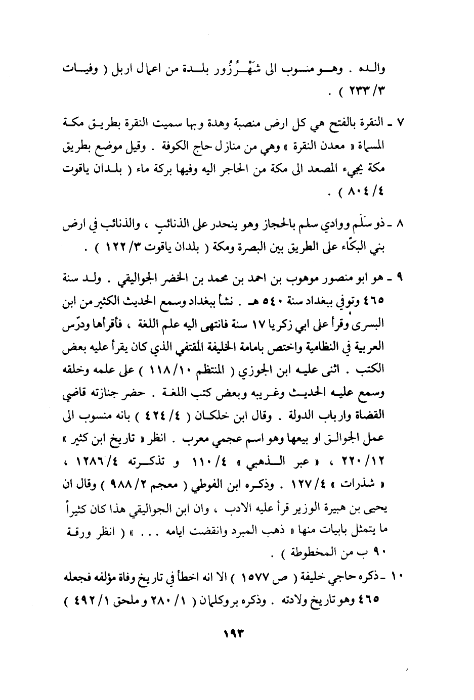 9- هو ابو منصور موهوب بن احمد بن محمد بن الخضر الجواليقي. ولد سنة 465 وتوفي ببغداد سنة 540 هـ. نشأ ببغداد وسمع الحديث الكثير من ابن البسرى وقرأ على ابي زكريا 17 سنة فانتهى اليه علم اللغة، فأقرأها ودرّس العربية في النظامية واختص بامامة الخليفة المقتفي الذي كان يقرأ عليه بعض الكتب. اثنى عليه ابن الجوزي (المنتظم 10/118) على علمه وخلقه وسمع عليه الحديث وغريبه وبعض كتب اللغة. حضر جنازته قاضي القضاة وارباب الدولة. وقال ابن خلكان (4/424) بانه منسوب الى عمل الجوالق او بيعها وهو اسم عجمي معرب. انظر «تاريخ ابن كثير» 12/220، «عبر الذهبي» 4/110 وتذكرته 4/1286، «شذرات» 4/127. وذكره ابن الفوطي (معجم 2/988) وقال ان يحيى بن هبيرة الوزير قرأ عليه الادب، وان ابن الجواليقي هذا كان كثيرا ما يتمثل بابيات منها «ذهب المبرد وانقضت ايامه ... » (انظر ورقة 90 ب من المخطوطة) .