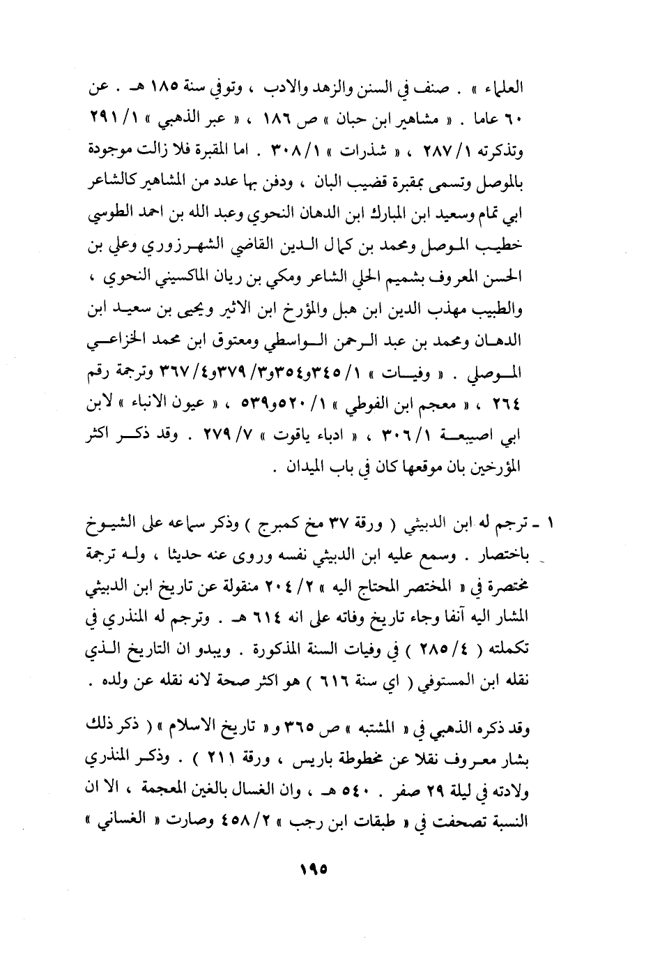 العلماء» . صنف في السنن والزهد والادب، وتوفي سنة 185 هـ. عن 60 عاما. «مشاهير ابن حبان» ص 186، «عبر الذهبي» 1/291 وتذكرته 1/287، «شذرات» 1/308. اما المقبرة فلا زالت موجودة بالموصل وتسمى بمقبرة قضيب البان، ودفن بها عدد من المشاهير كالشاعر ابي تمام وسعيد ابن المبارك ابن الدهان النحوي وعبد الله بن احمد الطوسي خطيب الموصل ومحمد بن كمال الدين القاضي الشهرزوري وعلي بن الحسن المعروف بشميم الحلي الشاعر ومكي بن ريان الماكسيني النحوي، والطبيب مهذب الدين ابن هبل والمؤرخ ابن الاثير ويحيى بن سعيد ابن الدهان ومحمد بن عبد الرحمن الواسطي ومعتوق ابن محمد الخزاعي الموصلي. «وفيات» 1/345 و 354 و 3/379 و 4/367 وترجمة رقم 264، «معجم ابن الفوطي» 1/520 و 539، «عيون الانباء» لابن ابي اصيبعة 1/306، «ادباء ياقوت» 7/279. وقد ذكر اكثر المؤرخين بان موقعها كان في باب الميدان.