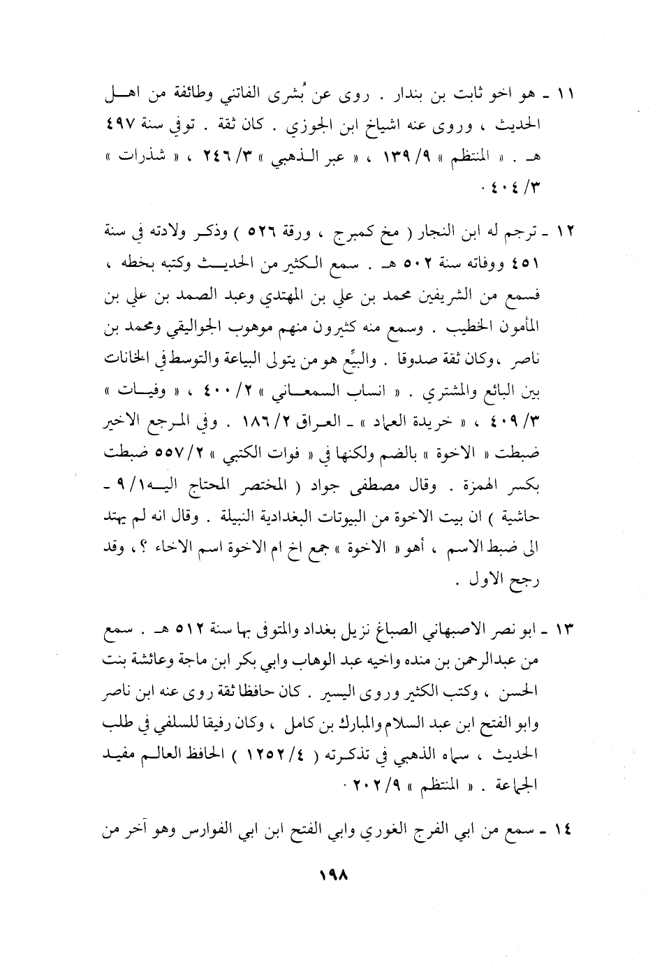 13- ابو نصر الاصبهاني الصباغ نزيل بغداد والمتوفى بها سنة 512 هـ. سمع من عبد الرحمن بن منده واخيه عبد الوهاب وابي بكر ابن ماجة وعائشة بنت الحسن، وكتب الكثير وروى اليسير. كان حافظا ثقة روى عنه ابن ناصر وابو الفتح ابن عبد السلام والمبارك بن كامل، وكان رفيقا للسلفي في طلب الحديث، سماه الذهبي في تذكرته (4/1252) الحافظ العالم مفيد الجماعة. «المنتظم» 9/202.